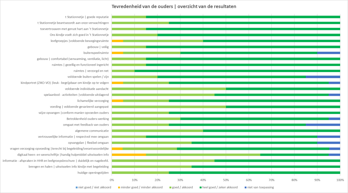 Groepsopvang Stationnetje houdt een jaarlijkse tevredenheidsbevraging. In 2025 deelden zo’n 20 ouders hun ervaringen. De resultaten tonen een heel hoge tevredenheid – een mooie bevestiging van de dagelijkse inzet van het team.